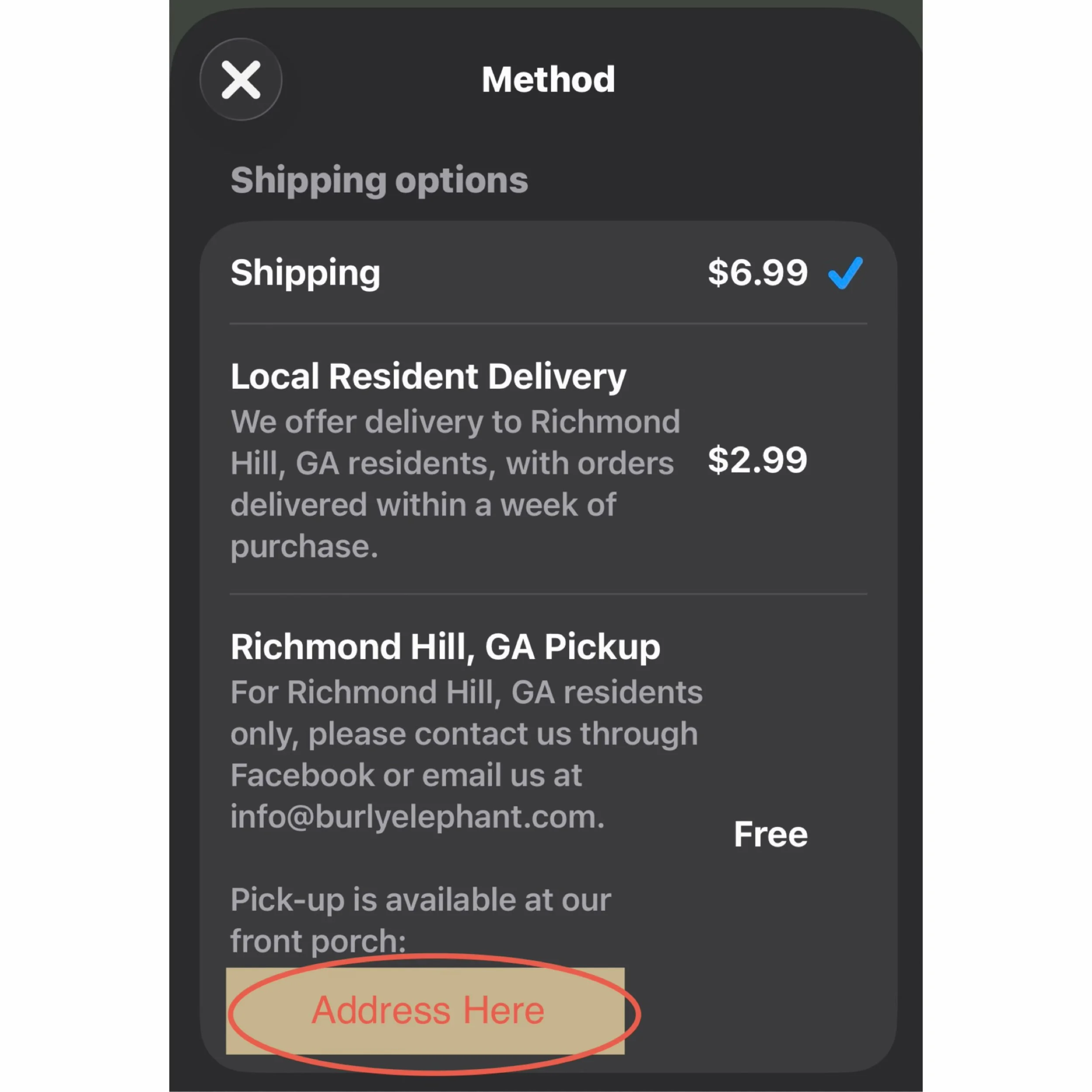 • Pick up anytime from our porch pickup box in Richmond Hill, GA